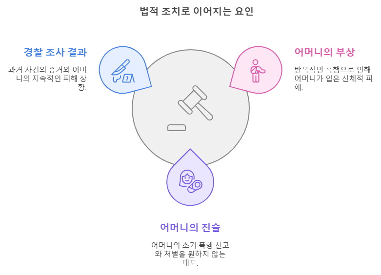 경찰 조사 결과, 과거에도 유사한 신고가 있었던 점과 피해자의 상습적인 폭력 피해 정황이 드러났습니다. 경찰은 이에 따라 상습존속폭행죄를 적용해 피해자의 의사와 무관하게 수사를 이어가고 있습니다.
