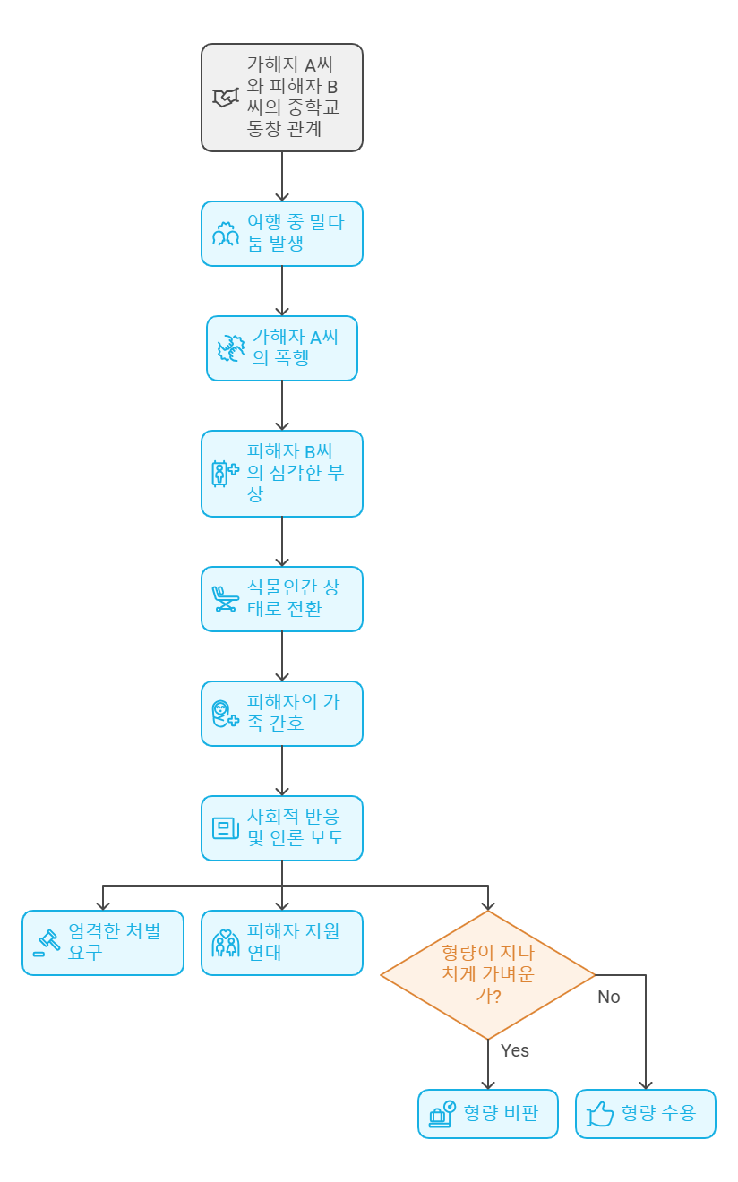 가해자 A씨는 피해자 B씨와 중학교 동창으로, 친구들과 여행 중 말다툼이 발생하자 B씨를 폭행했습니다. 이 폭행은 단순한 신체적 상해를 넘어, 피해자의 생명 유지가 어려운 상태를 초래했습니다.