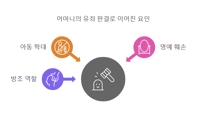 이아름의 모친 역시 사건에 연루되어 아동학대와 명예훼손에 대한 공범으로 기소되었습니다. 이아름의 모친은 자녀가 학대를 가하는 상황을 알고도 이를 방치하거나 방조한 혐의가 인정되었습니다. 또한, 이아름과 함께 허위 사실을 퍼뜨리는 데 가담한 혐의도 있었습니다. 결국 모친에게도 유죄가 선고되었습니다.