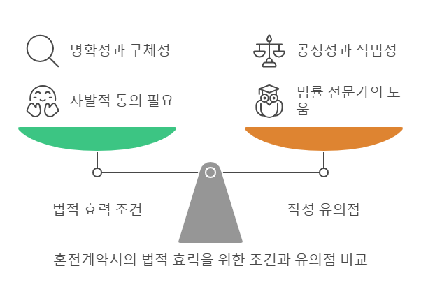 혼전계약서를 작성할 때는 반드시 법률 전문가의 도움을 받아야 합니다. 이를 통해 계약의 공정성과 적법성을 보장받을 수 있으며, 법적 분쟁의 소지를 줄일 수 있습니다. 계약 내용이 지나치게 일방적이거나 공공질서에 반할 경우, 법적 효력이 인정되지 않을 수 있음을 유념해야 합니다.