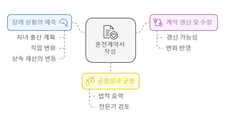 혼전계약서는 결혼 이후 예상되는 다양한 상황 변화를 고려하여 작성해야 합니다. 예를 들어 자녀 출산 계획, 상속 재산의 변동, 직업 변화 등의 상황을 반영할 필요가 있습니다. 예를 들어, 자녀 계획, 직업 변화, 상속 등의 가능성을 고려하여 계약 조항을 구성하는 것이 필요합니다.