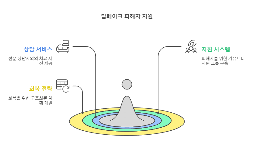 딥페이크 범죄의 피해자들은 극심한 심리적 고통을 경험합니다. 사회적 낙인과 개인적인 불안감은 피해자의 일상생활을 크게 방해합니다. 이를 해결하기 위해 정부와 민간 단체는 심리 상담과 치료 프로그램을 제공해야 합니다. 피해자가 안정감을 찾을 수 있도록 지원 시스템을 구축하고, 장기적인 심리적 회복을 도울 수 있는 방안을 마련하는 것이 필요합니다.