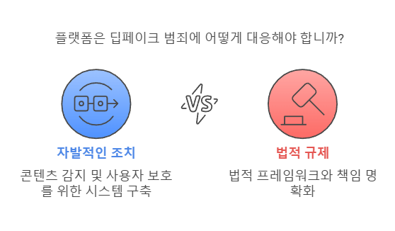 딥페이크 범죄가 SNS나 텔레그램 같은 플랫폼을 통해 확산되는 경우, 플랫폼 운영자의 책임이 중요합니다. 유해 콘텐츠를 신속히 감지하고 삭제할 수 있는 시스템을 구축하고, 플랫폼 운영자가 사용자 보호를 위한 정책을 강화해야 합니다. 이를 위해 법적 규제를 강화하고, 플랫폼의 책임 범위를 명확히 하는 입법적 조치가 필요합니다.