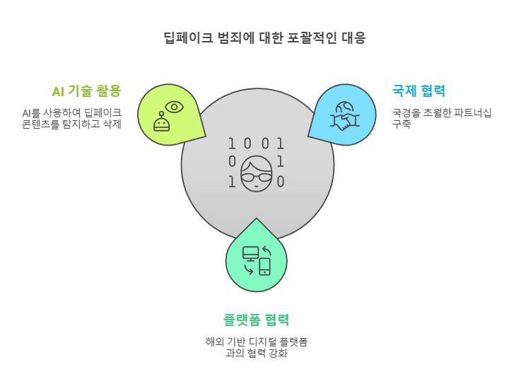 딥페이크 범죄는 디지털 플랫폼의 특성상 국경을 초월하여 발생할 가능성이 높습니다. 이에 국제적 협력이 필수적입니다. 특히, 텔레그램과 같은 해외 기반 플랫폼의 협조를 강화할 필요가 있습니다. 또한, AI 기술을 활용해 딥페이크 콘텐츠를 자동으로 탐지하고 삭제하는 기술적 대응 방안도 고려되어야 합니다.