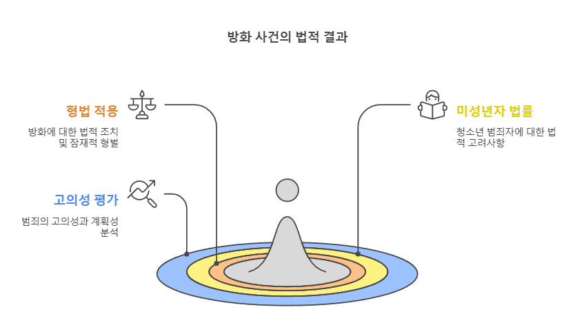 대한민국 형법에 따르면, 공용건조물에 대한 방화는 중대한 범죄로 간주되며, 무기징역 또는 3년 이상의 징역에 처할 수 있는 범죄입니다. 이번 사건은 법원이라는 공공건조물을 대상으로 했다는 점에서, 해당 법조항의 적용이 유력해 보입니다. 특히, 방화의 고의성과 계획성이 명확히 드러난 만큼 엄중한 처벌이 예상됩니다.