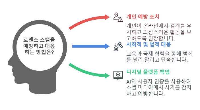 사회적 약자를 대상으로 한 범죄를 예방하기 위해서는 교육 프로그램과 홍보 캠페인을 통해 로맨스 스캠의 위험성을 널리 알릴 필요가 있습니다. 법적으로는 국제 공조를 강화해 범죄 네트워크를 추적하고, 가해자에 대한 강력한 처벌이 이루어져야 합니다.
