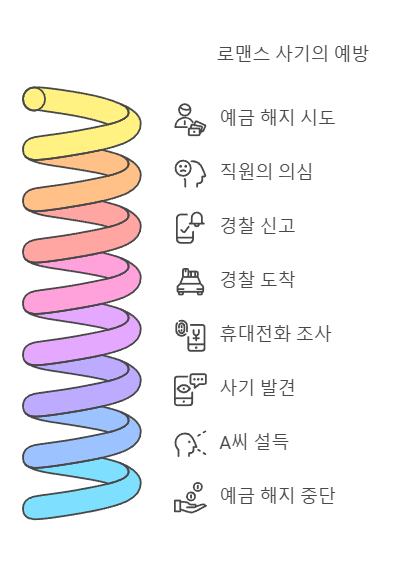 조사 결과, A씨는 한 채팅 애플리케이션에서 알게 된 여성이 연인처럼 접근해 금전적 요구를 한 사실이 드러났습니다. 여성은 대출 관련 애플리케이션 설치를 유도하고 계좌 이체를 요구했으며, 이러한 방식은 전형적인 로맨스 스캠의 수법에 해당합니다. A씨는 결국 우체국 직원과 경찰의 설득으로 예금 해지를 중단하고 큰 피해를 면할 수 있었습니다.