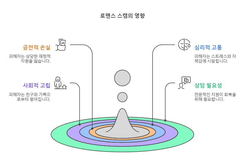 로맨스 스캠의 피해는 단순히 금전적 손실에 그치지 않고, 피해자의 심리적·사회적 삶에 큰 영향을 미칩니다. 예컨대, 피해자 중 한 여성은 사기 이후 심각한 자책감에 빠져 상담 치료를 받기 시작했으며, 일상생활 복귀까지 수개월이 걸렸습니다.