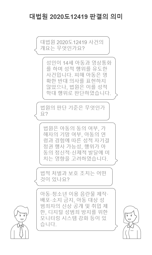 대법원 2020도12419 사건은 성인이 14세 아동과 영상통화를 하면서 성적 행위를 유도하고 이를 화면에 노출하도록 요구한 사례입니다. 피해 아동은 명확한 반대 의사를 표현하지 않았으나, 법원은 이를 성적 학대 행위로 판단하였습니다. 이는 아동이 충분한 판단력을 갖추지 못한 상태에서 성적 자기결정권을 행사할 수 없는 상황을 고려한 결정이었습니다.