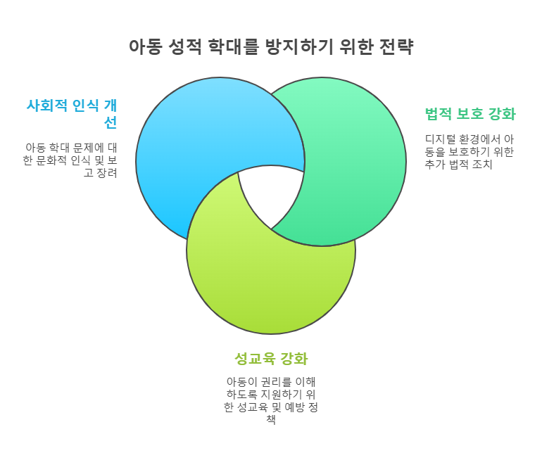 현재 대한민국 법률은 아동·청소년의 성적 학대를 방지하기 위한 다양한 조항을 포함하고 있지만, 온라인 성범죄 증가 등의 새로운 위험 요소에 대한 대응이 미흡한 실정입니다. 디지털 환경에서의 성적 착취 방지를 위한 추가적인 법적 보호 조치가 필요합니다.