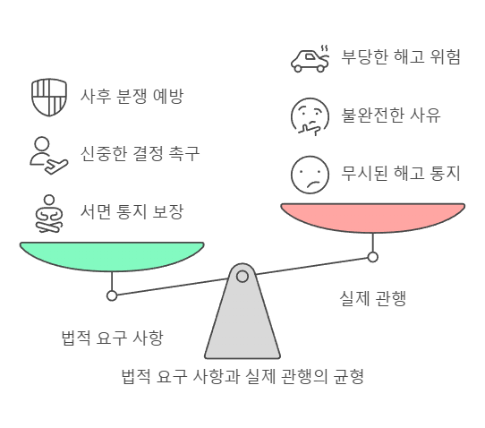 사용자는 근로자를 해고할 경우, 반드시 해고사유와 해고시기를 서면으로 명확히 기재해야 하며, 이를 위반할 경우 해고의 적법성이 부정될 가능성이 높습니다. 그러나 현실에서는 많은 사용자가 이러한 절차를 준수하지 않으며, 이에 대응하지 않으면 근로자는 불리한 상황에 처할 수 있습니다.