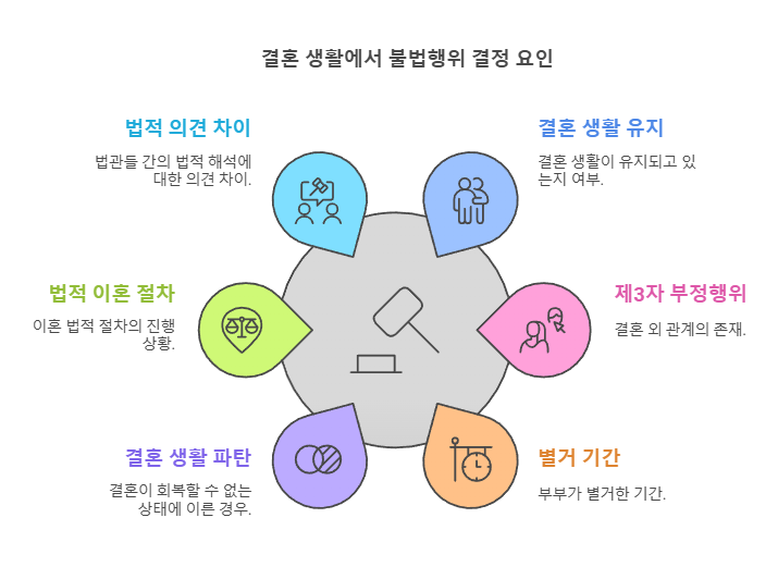 제3자의 행위가 불법행위로 인정되기 위해서는 부부공동생활이 유지되고 있다는 사실이 전제되어야 합니다. 즉, 실질적 부부공동생활이 유지되지 않는 상태라면 제3자의 행위가 불법행위로 인정될 가능성은 낮아집니다.