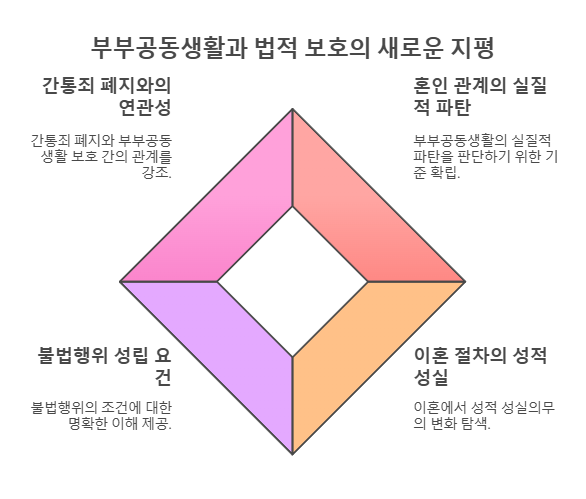본 판결은 2015년 헌법재판소의 간통죄 위헌 결정과 연관되며, 성적 자기결정권과 부부공동생활의 법적 보호 간 균형을 맞추는 방향으로 법리가 형성되고 있음을 보여줍니다. 이로 인해 향후 유사한 사례에서 법원의 해석 방향에 중요한 영향을 미칠 것입니다.