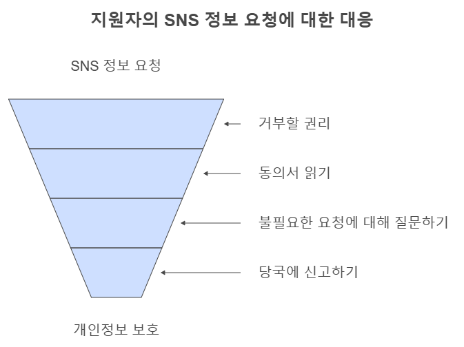 지원자는 채용 과정에서 SNS 정보 제공 요구에 대해 거부할 권리가 있습니다. 개인정보 제공 동의서를 면밀히 읽고 불필요한 정보 제공 요구에 대해선 의문을 제기하는 것이 중요합니다. 만약 SNS 정보 제공을 강요받았거나, 불합리하게 정보가 수집되었다고 판단될 경우 개인정보보호위원회 또는 고용노동부에 신고할 수 있습니다.
