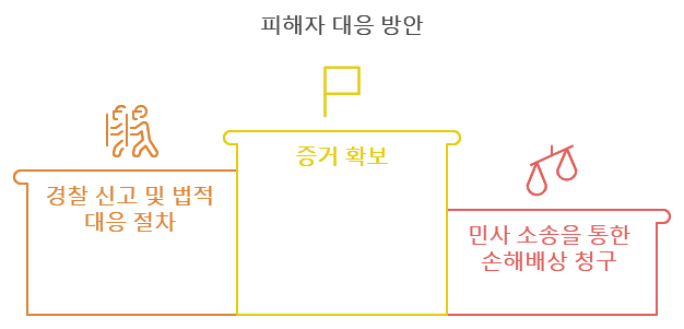 민사 소송을 통해 금전적 손해와 정신적 피해에 대한 배상을 청구할 수 있습니다. 손해배상 청구 시에는 피해자가 입은 피해를 구체적으로 입증할 필요가 있으며, 이를 위해 증거가 반드시 필요합니다.